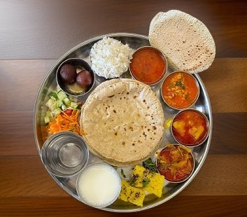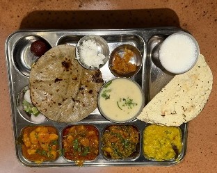 | 1 Green sabji | 1 Kathod sabji | 1 Aloo Sabji | Roti, Dal, Rice. | Roasted Papad (Limited) | Bt. Milk (Limited) | 1 Farshan (Limited) |