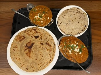 | 1 Paneer Sabji | 1 Veg. Sabji | 3 Parotha / 3 Roti. | Dal Fry Jeera Rice. | Roasted Papad. | Butter Milk | Salad, Pickle | Sweet Gulab jamun (2 Pcs.) |